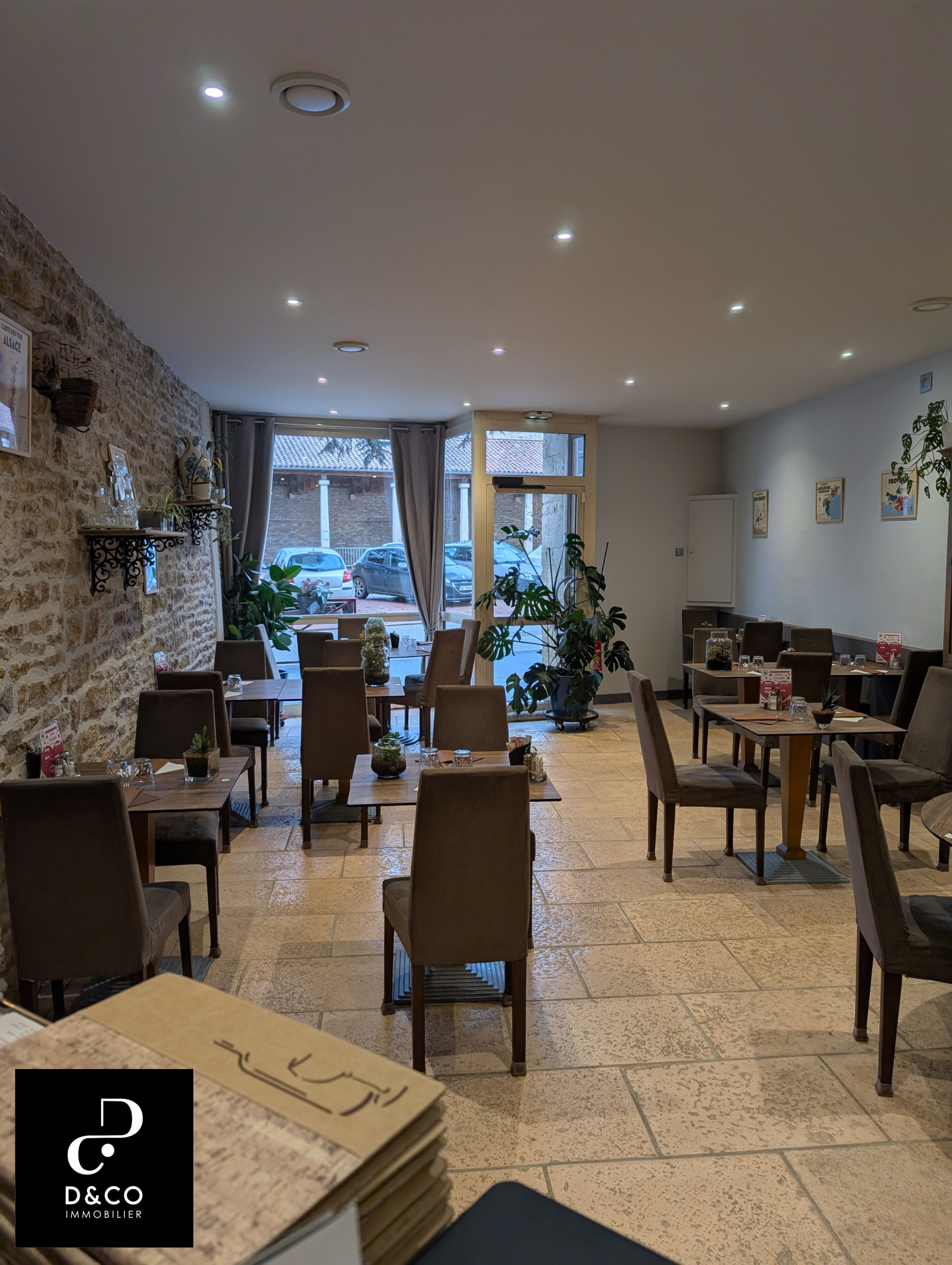 Capacité intérieure : 60 couverts répartis sur deux salles. Terrasse : 20 couverts sur un espace agréable et ombragée. Stationnement : 2 parkings publics dont 1 en face. Le restaurant dispose d'un mobilier récent, d'une cuisine parfaitement équipée (hotte, matériel professionnel de qualité, four à pizza, chambre froide récente, arrièrre cuisine spacieuse, plusieurs caves de rangement dont une cave à vin).