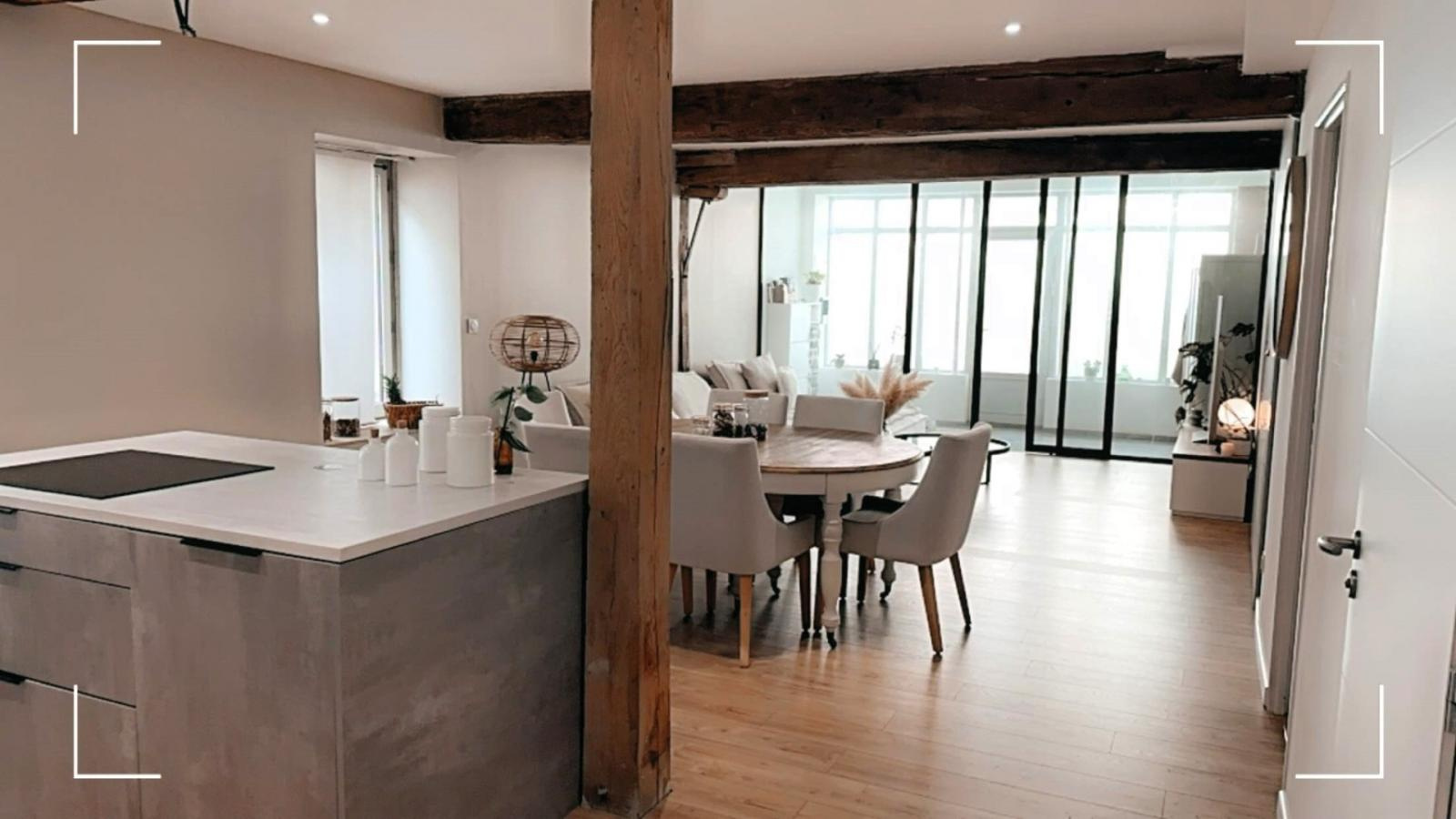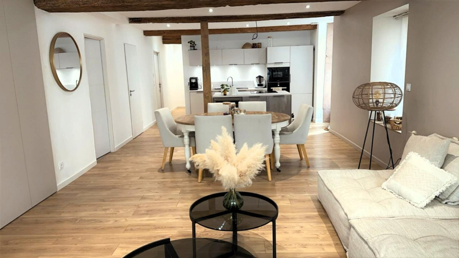 Entièrement rénové, ce T4 offre de beaux volumes. une entrée avec portes coulissantes ouvrant sur un grand espace de vie salon, salle-à manger avec cuisine ouverte de 44.23 m². Une salle de bains avec baignoire d'angle, 3 chambres de 10.99 et 11.05 m² et une suite parentale de 21.94 m² avec dressing et salle d'eau . LES PLUS : - De belles prestations : cave intégrée, chauffage au sol. - plein centre, accès à tous commerce et services - 12 minutes de Mâcon - 1 place de parking - possibilité de poser une table côté cour