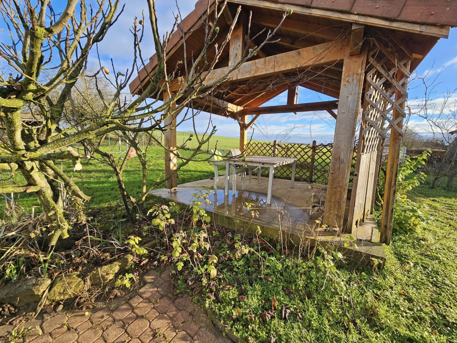 Côté extérieur, une terrasse carrelée devant la cuisine pour contempler le coucher de soleil, une pergolas en bois derrière la maison pour profiter d'une vue dégagée sur les champs et d'un terrain arboré : retrouvez des figues, framboises, cerises, pommes.