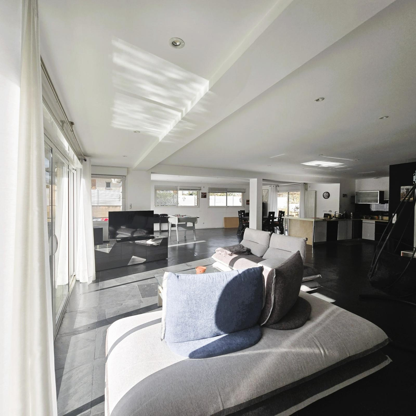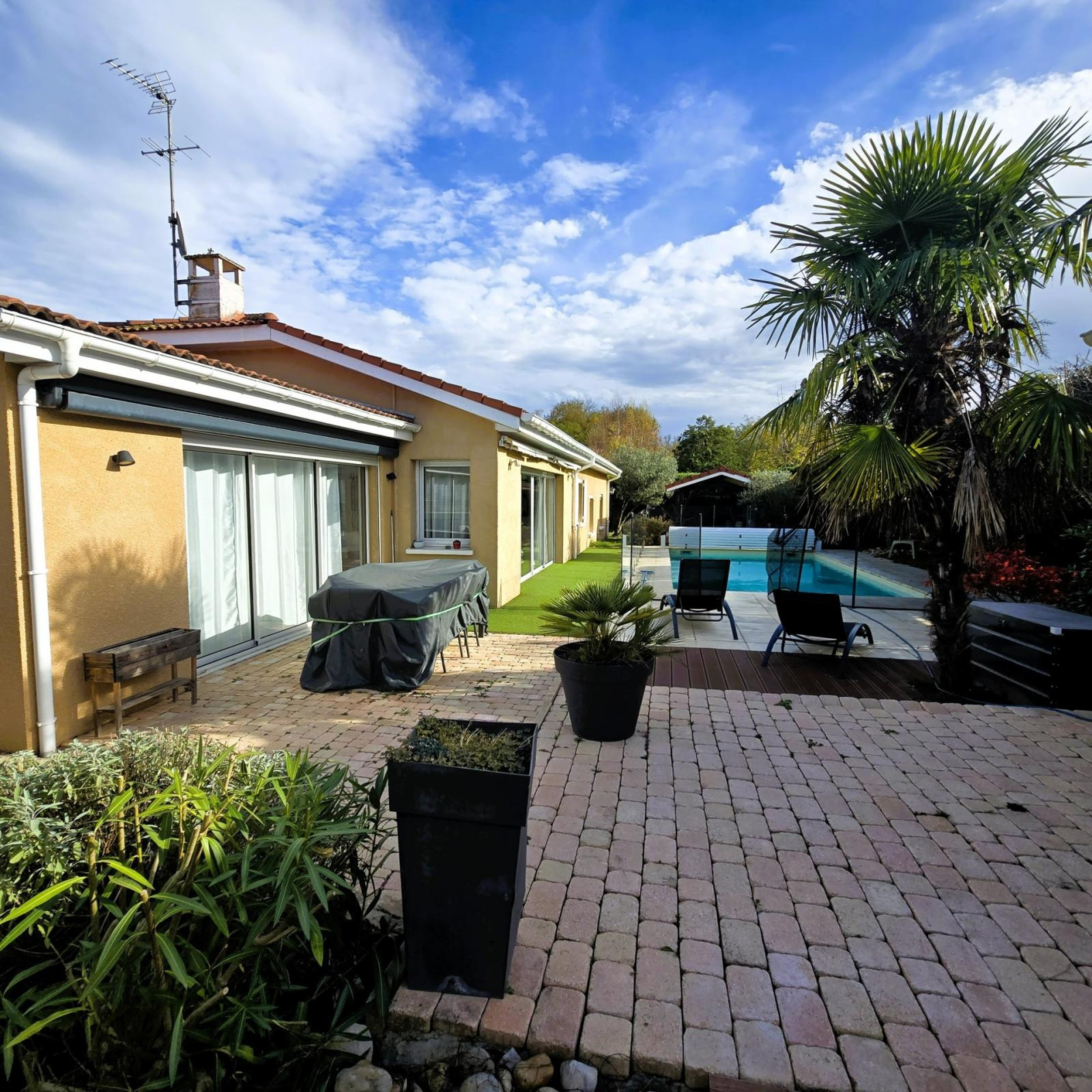 Grièges (01290)À vendre, rare sur le secteur : très belle maison de plain-pied, située à GRIEGES, à quelques minutes de MÄCON et du c'ur de la Bourgogne. Si votre priorité est d'avoir un grand espace de vie d'env 90 m2, très lumineux avec vue piscine, cette maison est faite pour vous ! Caractéristiques : ? Superficie habitable 192 m² . Pièce de vie de plus de 90 m² avec cuisine ouverte, grande baie à galandage ? Terrain clos et arboré de 860 m² ? Piscine avec pompe neuve ? 3 chambres possibilité 4 ? 1 salle d'eau, possibilité 3 1 buanderie 1 garage Cadre de vie privilégié, à proximité des écoles et commerces, à deux pas de la nature, avec un accès facile à Lyon, Genève (1h30) et Paris.