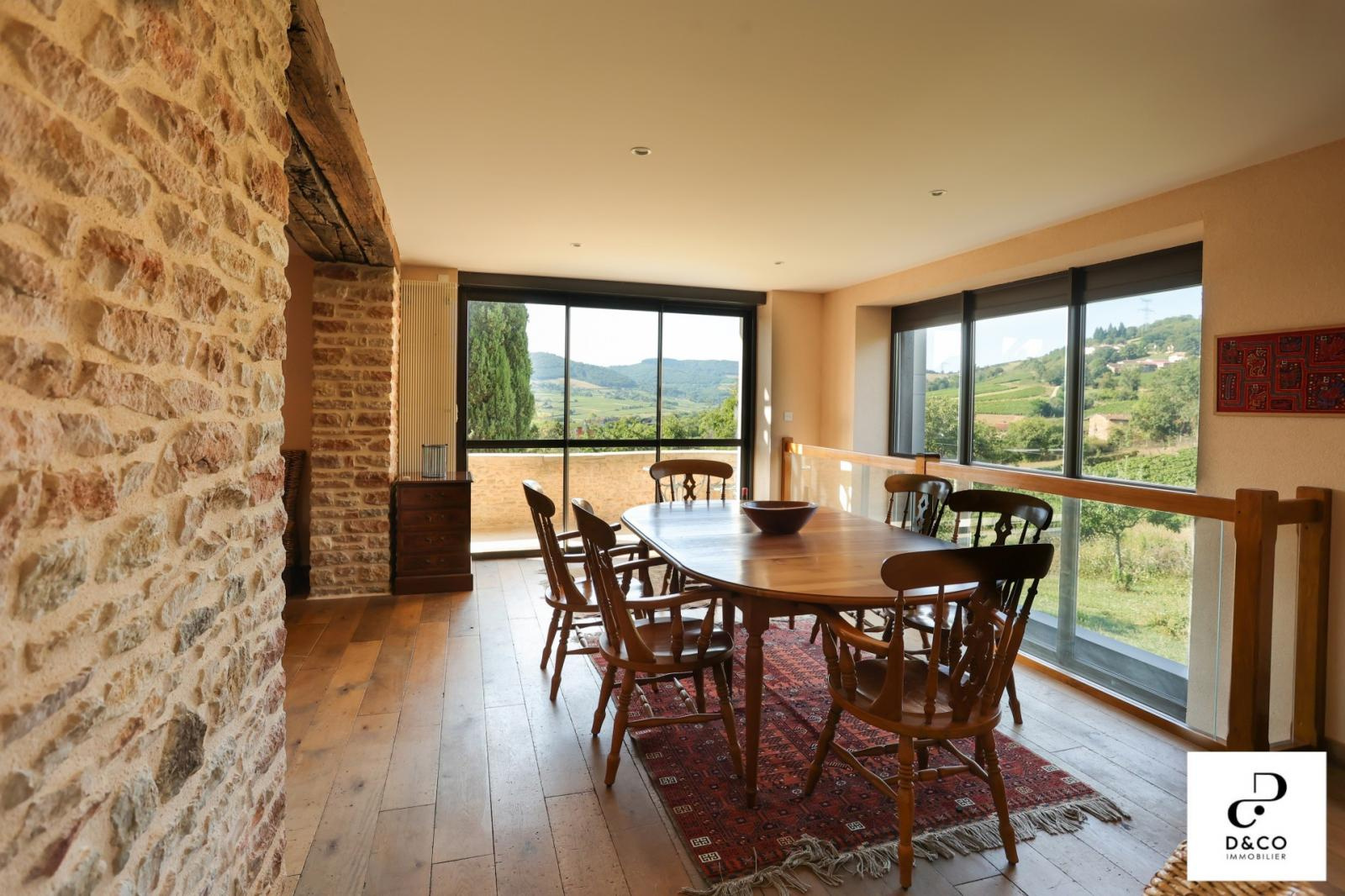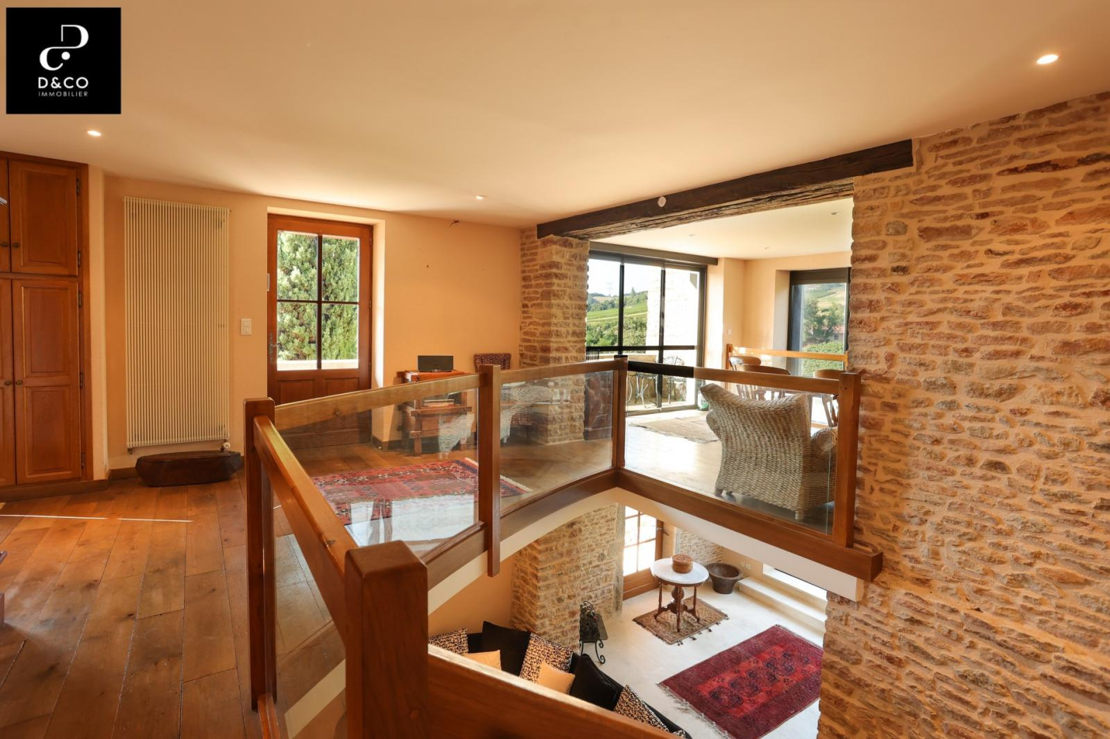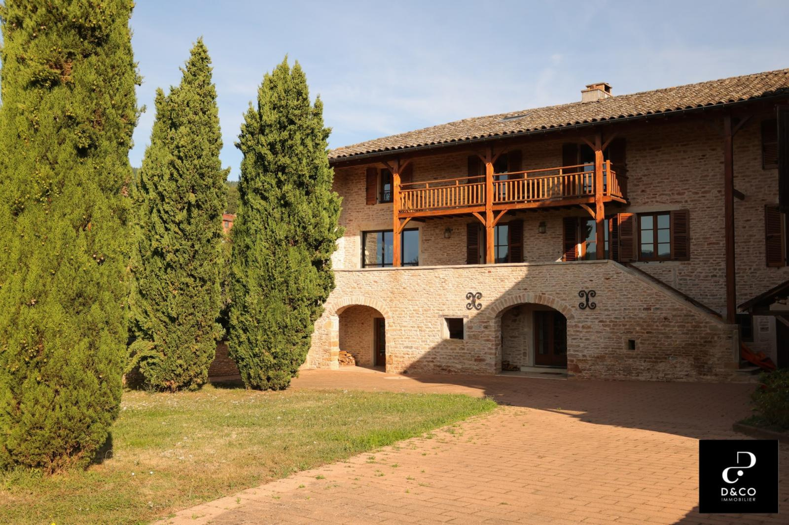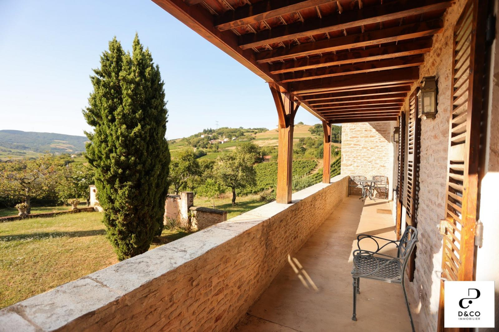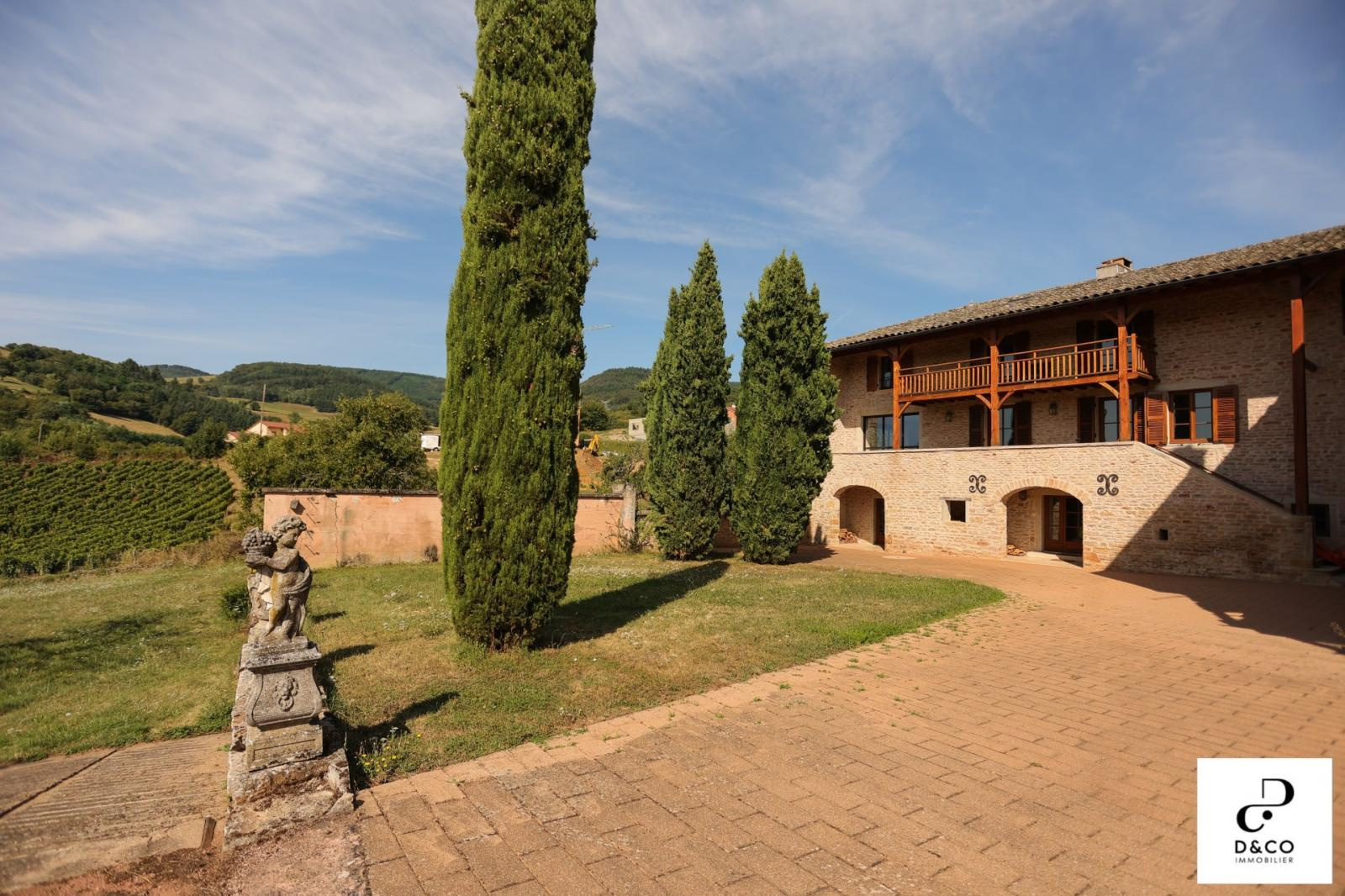 A à 35 minutes nord de VILLEFRANCHE, et à 15 minutes des gares de Macon ville et TGV, au c'ur du Val Lamartinien, découvrez cette magnifique demeure en pierre dans son écrin de verdure, offrant une vue panoramique à couper le souffle sur le château de Pierreclos (XIIe siècle), le vignoble et les collines boisées environnantes. Ce bien exceptionnel, imprégné de charme et d'authenticité, est gage de calme et de tranquillité. La propriété possède une partie rénovée de 220 m² sur trois étages, aux matériaux nobles: murs en pierres jointées, sols en parquet bois ou pierre de Bourgogne. Une magnifique baie vitrée sur deux étages baigne le salon et la salle à manger d'une lumière remarquable, qui donne à cette demeure un caractère unique. La cuisine ouverte se démarque par son sol en tomettes. Au rez-de-chaussée, une cheminée ancienne s'insère dans un grand salon avec plafond cathédrale. Comme toutes les maisons vigneronnes, celle-ci possède sa galerie mâconnaise ainsi qu'une terrasse au second étage, qui offre une vue imprenable. Le 2e étage comprend trois chambres pleines de caractère (et avec vue !) : une parentale avec baignoire et toilette privative, deux avec une salle d'eau à proximité. Au 1er étage se trouve une quatrième chambre, avec salle d'eau et toilette contigües. Ouverte sur la terrasse du 2e étage, la grande pièce « bibliothèque bureau », équipée de deux fenêtres de toit et d'une poutre magistrale, est une pièce absolument magique. Buanderie, chaufferie (gaz de ville chaudière De Dietrich), vastes placards de rangement et toilette équipent confortablement le rez-de-chaussée. Une grande cave voûtée en pierres, de 43 m², avec sol en briques de terre cuite, ajoute un cachet supplémentaire à ce bien d'exception. Quant aux bricoleurs, un atelier est à leur disposition. L'extérieur n'est pas en reste avec sa cour en pavé puis en gravillon et son espace vert arboré de pommiers, poirier, cerisiers, pruniers, mirabelliers, pêchers et cyprès sur plus de 2200 m². Un garage fermé peut recevoir deux voitures, tandis que la cour permet de parquer au moins quatre véhicules. Pour ceux qui aimeraient s'agrandir ou créer une activité parallèle, un bâtiment sur deux niveaux peut être restauré pour proposer environ 100 m² habitables. La toiture de l'ensemble des bâtiments est récente. Cette magnifique demeure à l'esprit cosy et chaleureux, se situe à 10 minutes de la gare TGV Mâcon Loché soit 1heure 50 de PARIS. En voiture, à 45 minutes de LYON et 1heure 55 de GENEVE. Supermarché, Pharmacie, Tea room, boulangerie et boucherie charcuterie sont à 8 minutes. Cette remarquable propriété est non seulement un lieu de résidence idéal, mais elle présente également une excellente opportunité d'investissement dans une région prisée pour son cadre de vie très agréable ainsi que pour la variété des activités et centres d'intérêt offerts, tant culturels que de loisirs : Gastronomie et vignobles de Bourgogne Cluny et sa fameuse abbaye, nombreux châteaux Randonnées pédestres et à cheval, Itinéraires cyclables. Je reste à votre écoute pour tout renseignements au 06.88.88.55.61 Laurent SINTES D&CO, LA ROCHE VINEUSE. Honoraires à charge Acquéreurs. Les informations sur les risques auxquels ce bien est exposé sont disponibles sur le site Géorisques : www. georisques.gouv.fr. Agent commercial RSAC Mâcon 449.566.785 - www.dandco-immobilier.com.