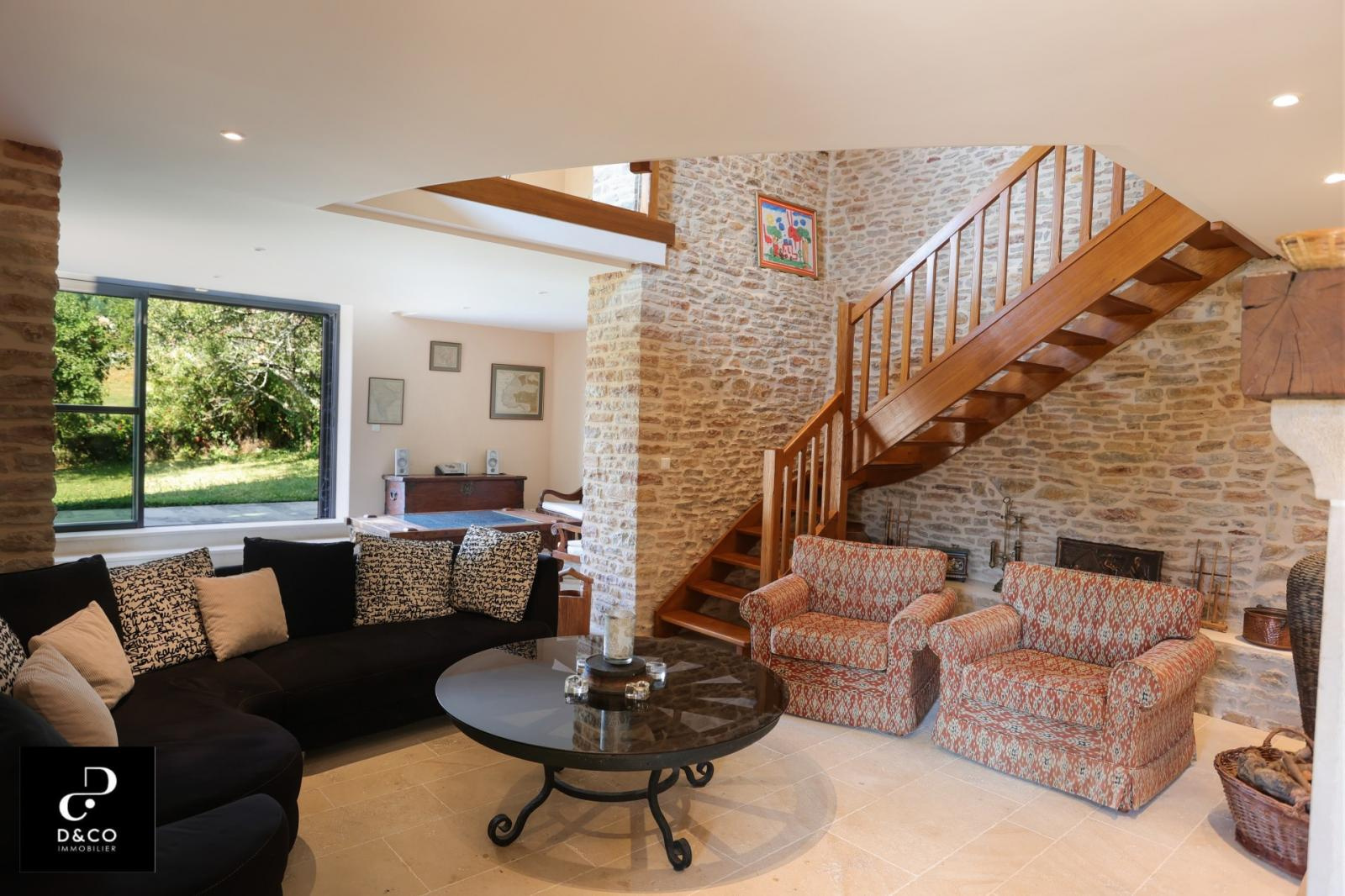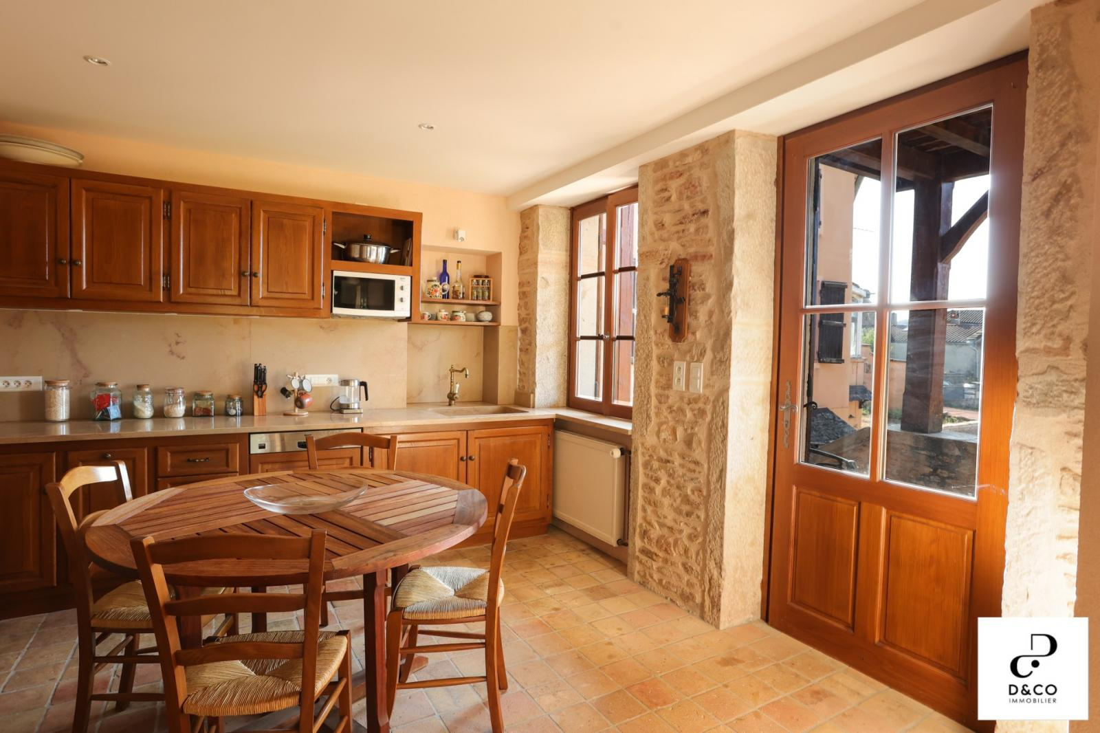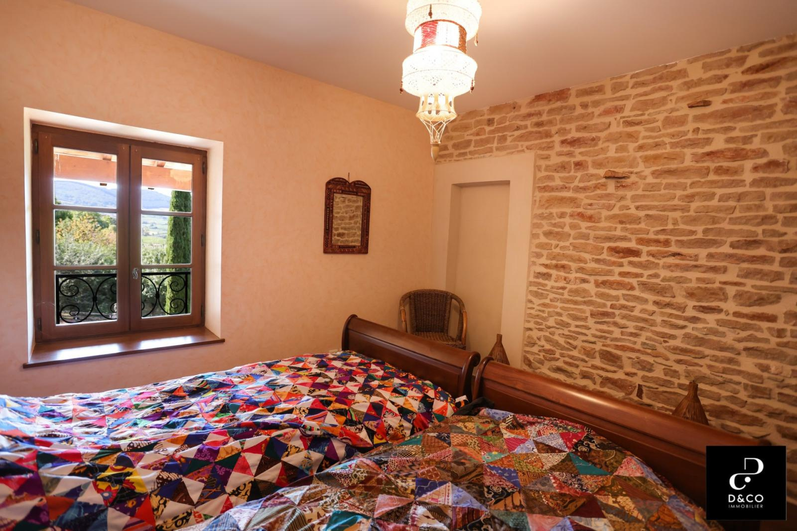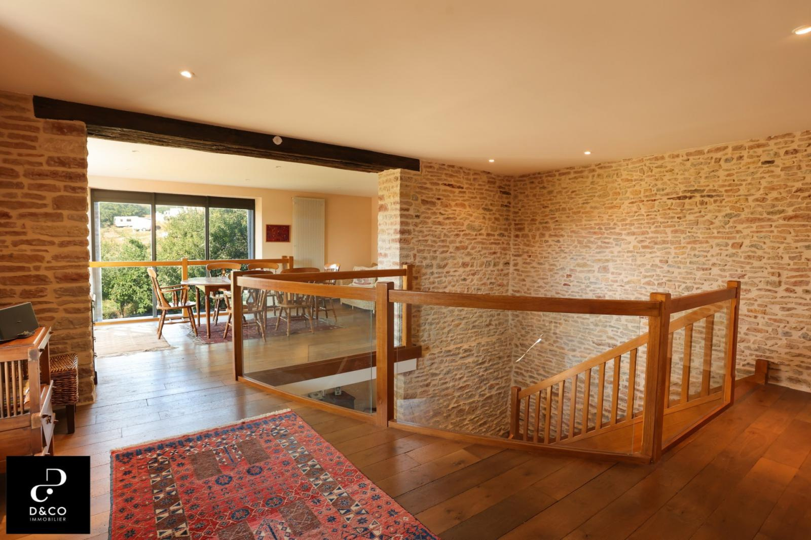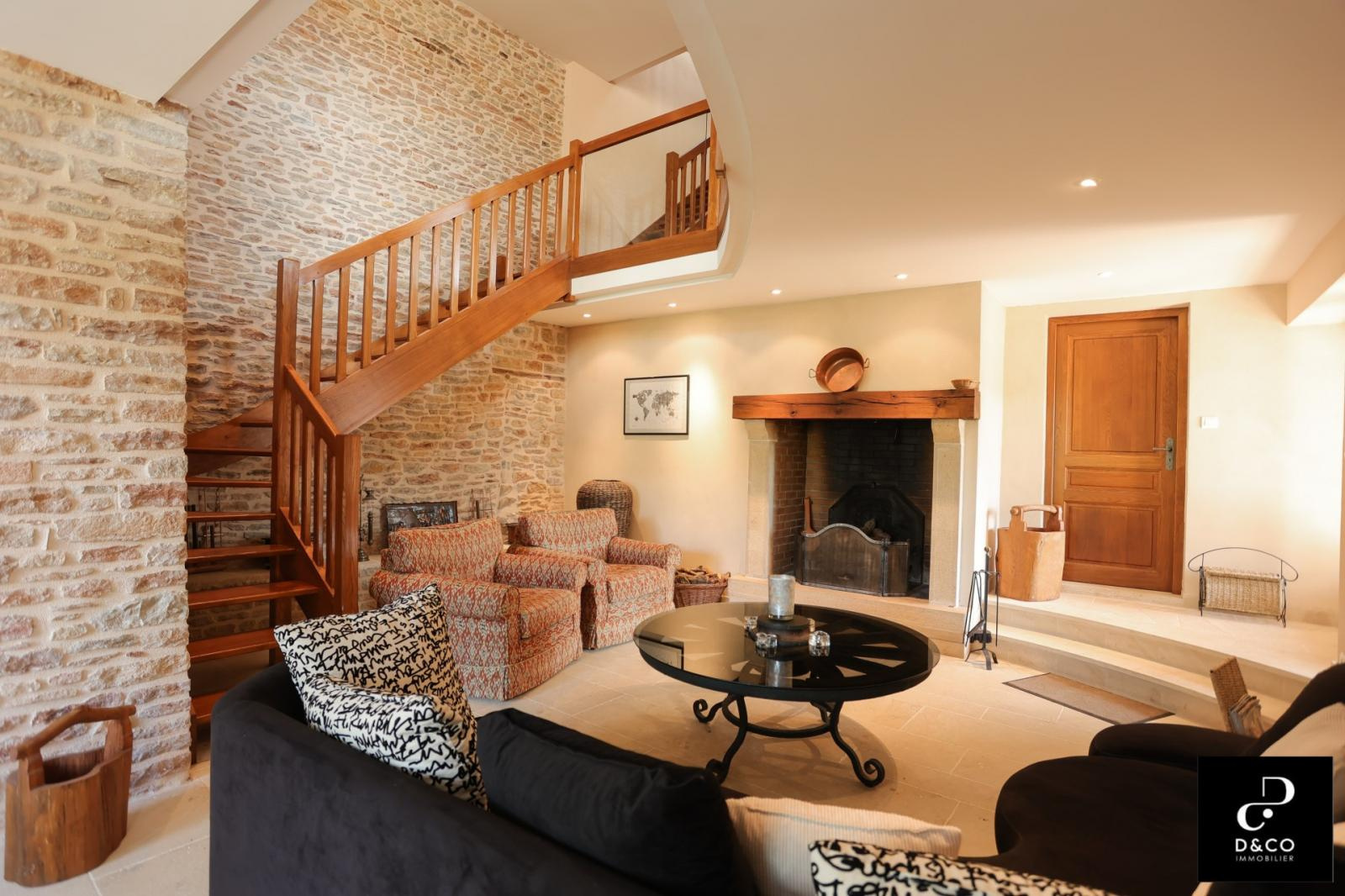 A à 35 minutes nord de VILLEFRANCHE, et à 15 minutes des gares de Macon ville et TGV, au c'ur du Val Lamartinien, découvrez cette magnifique demeure en pierre dans son écrin de verdure, offrant une vue panoramique à couper le souffle sur le château de Pierreclos (XIIe siècle), le vignoble et les collines boisées environnantes. Ce bien exceptionnel, imprégné de charme et d'authenticité, est gage de calme et de tranquillité. La propriété possède une partie rénovée de 220 m² sur trois étages, aux matériaux nobles: murs en pierres jointées, sols en parquet bois ou pierre de Bourgogne. Une magnifique baie vitrée sur deux étages baigne le salon et la salle à manger d'une lumière remarquable, qui donne à cette demeure un caractère unique. La cuisine ouverte se démarque par son sol en tomettes. Au rez-de-chaussée, une cheminée ancienne s'insère dans un grand salon avec plafond cathédrale. Comme toutes les maisons vigneronnes, celle-ci possède sa galerie mâconnaise ainsi qu'une terrasse au second étage, qui offre une vue imprenable. Le 2e étage comprend trois chambres pleines de caractère (et avec vue !) : une parentale avec baignoire et toilette privative, deux avec une salle d'eau à proximité. Au 1er étage se trouve une quatrième chambre, avec salle d'eau et toilette contigües. Ouverte sur la terrasse du 2e étage, la grande pièce « bibliothèque bureau », équipée de deux fenêtres de toit et d'une poutre magistrale, est une pièce absolument magique. Buanderie, chaufferie (gaz de ville chaudière De Dietrich), vastes placards de rangement et toilette équipent confortablement le rez-de-chaussée. Une grande cave voûtée en pierres, de 43 m², avec sol en briques de terre cuite, ajoute un cachet supplémentaire à ce bien d'exception. Quant aux bricoleurs, un atelier est à leur disposition. L'extérieur n'est pas en reste avec sa cour en pavé puis en gravillon et son espace vert arboré de pommiers, poirier, cerisiers, pruniers, mirabelliers, pêchers et cyprès sur plus de 2200 m². Un garage fermé peut recevoir deux voitures, tandis que la cour permet de parquer au moins quatre véhicules. Pour ceux qui aimeraient s'agrandir ou créer une activité parallèle, un bâtiment sur deux niveaux peut être restauré pour proposer environ 100 m² habitables. La toiture de l'ensemble des bâtiments est récente. Cette magnifique demeure à l'esprit cosy et chaleureux, se situe à 10 minutes de la gare TGV Mâcon Loché soit 1heure 50 de PARIS. En voiture, à 45 minutes de LYON et 1heure 55 de GENEVE. Supermarché, Pharmacie, Tea room, boulangerie et boucherie charcuterie sont à 8 minutes. Cette remarquable propriété est non seulement un lieu de résidence idéal, mais elle présente également une excellente opportunité d'investissement dans une région prisée pour son cadre de vie très agréable ainsi que pour la variété des activités et centres d'intérêt offerts, tant culturels que de loisirs : Gastronomie et vignobles de Bourgogne Cluny et sa fameuse abbaye, nombreux châteaux Randonnées pédestres et à cheval, Itinéraires cyclables. Je reste à votre écoute pour tout renseignements au 06.88.88.55.61 Laurent SINTES D&CO, LA ROCHE VINEUSE. Honoraires à charge Acquéreurs. Les informations sur les risques auxquels ce bien est exposé sont disponibles sur le site Géorisques : www. georisques.gouv.fr. Agent commercial RSAC Mâcon 449.566.785 - www.dandco-immobilier.com.