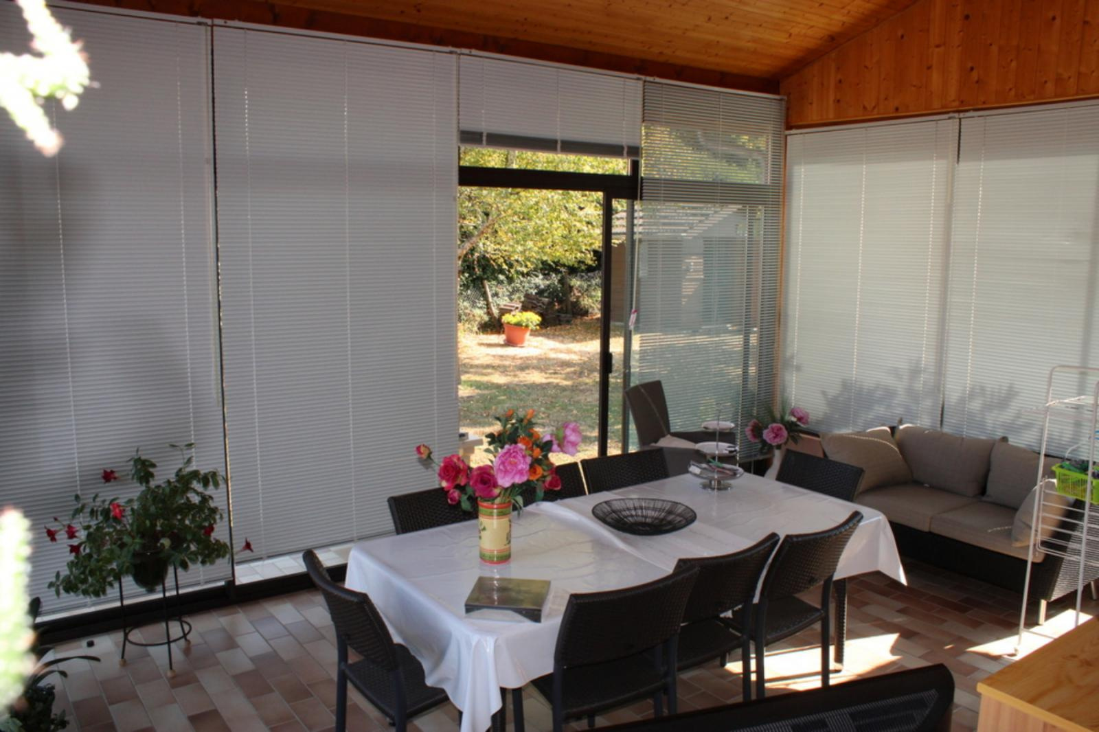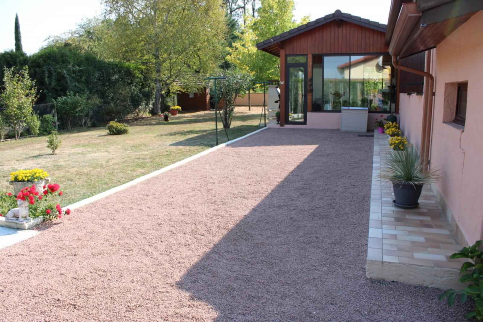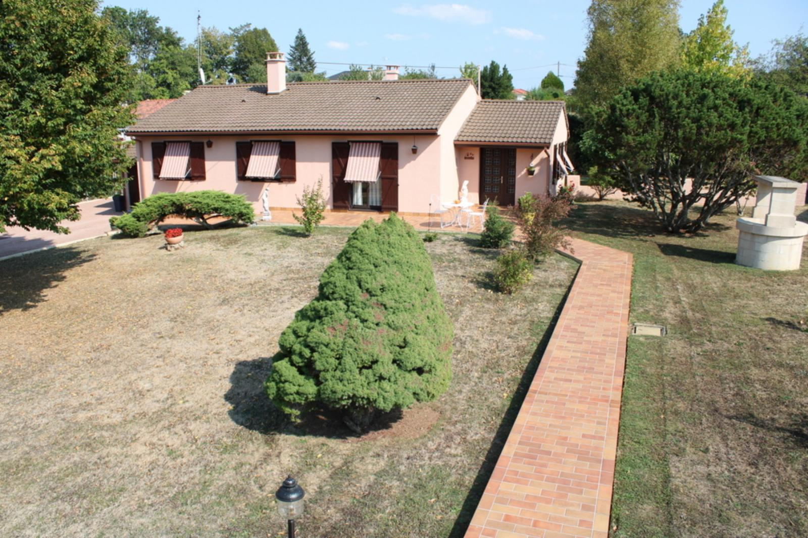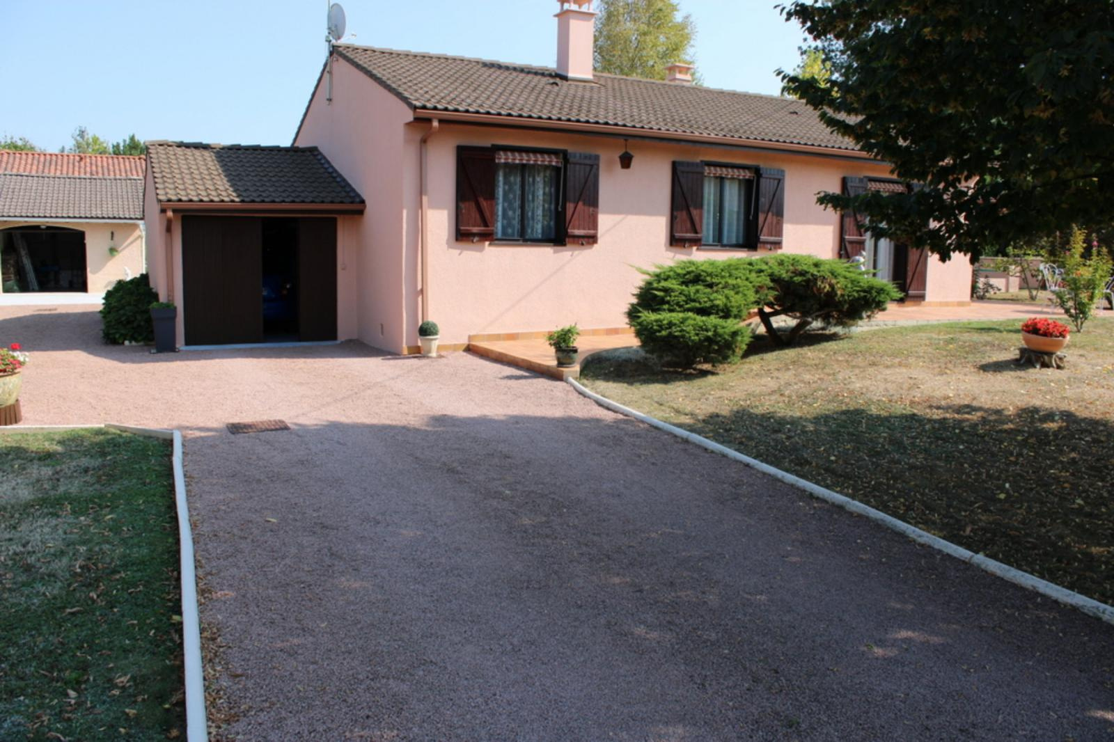Mézériat Ravissante villa de plain pied composée d'une entrée, cellier, cuisine indépendante aménagée équipée, séjour, belle véranda, 3 chambres, salle de bains, WC, garage attenant et garage indépendant, chalet de jardin le tout sur un spacieux terrain de 1429 m² clos et arboré.