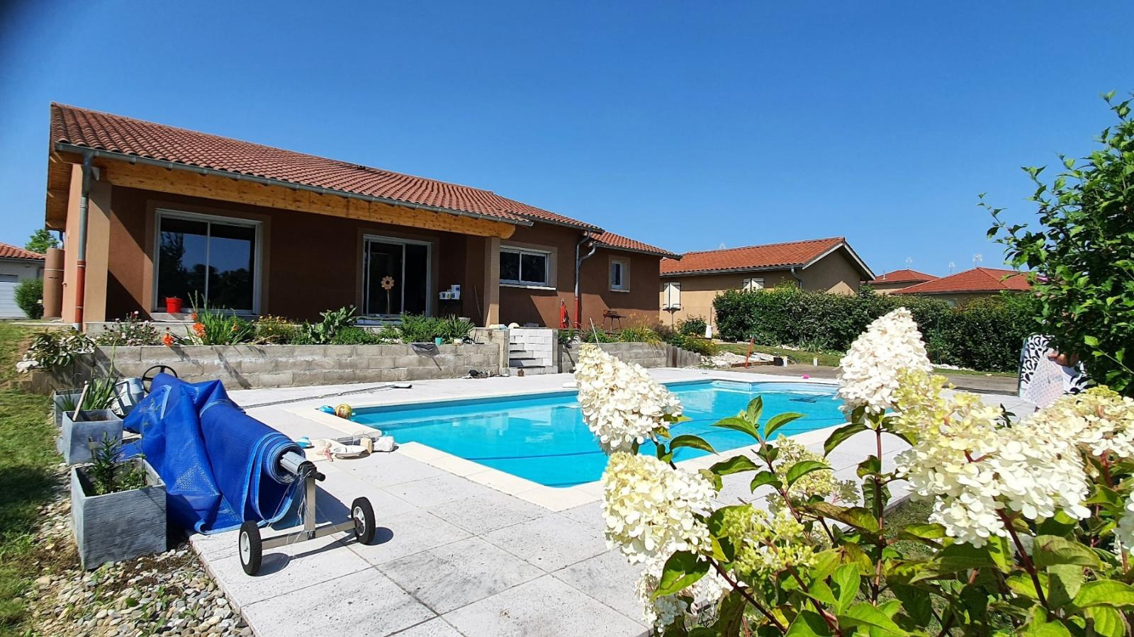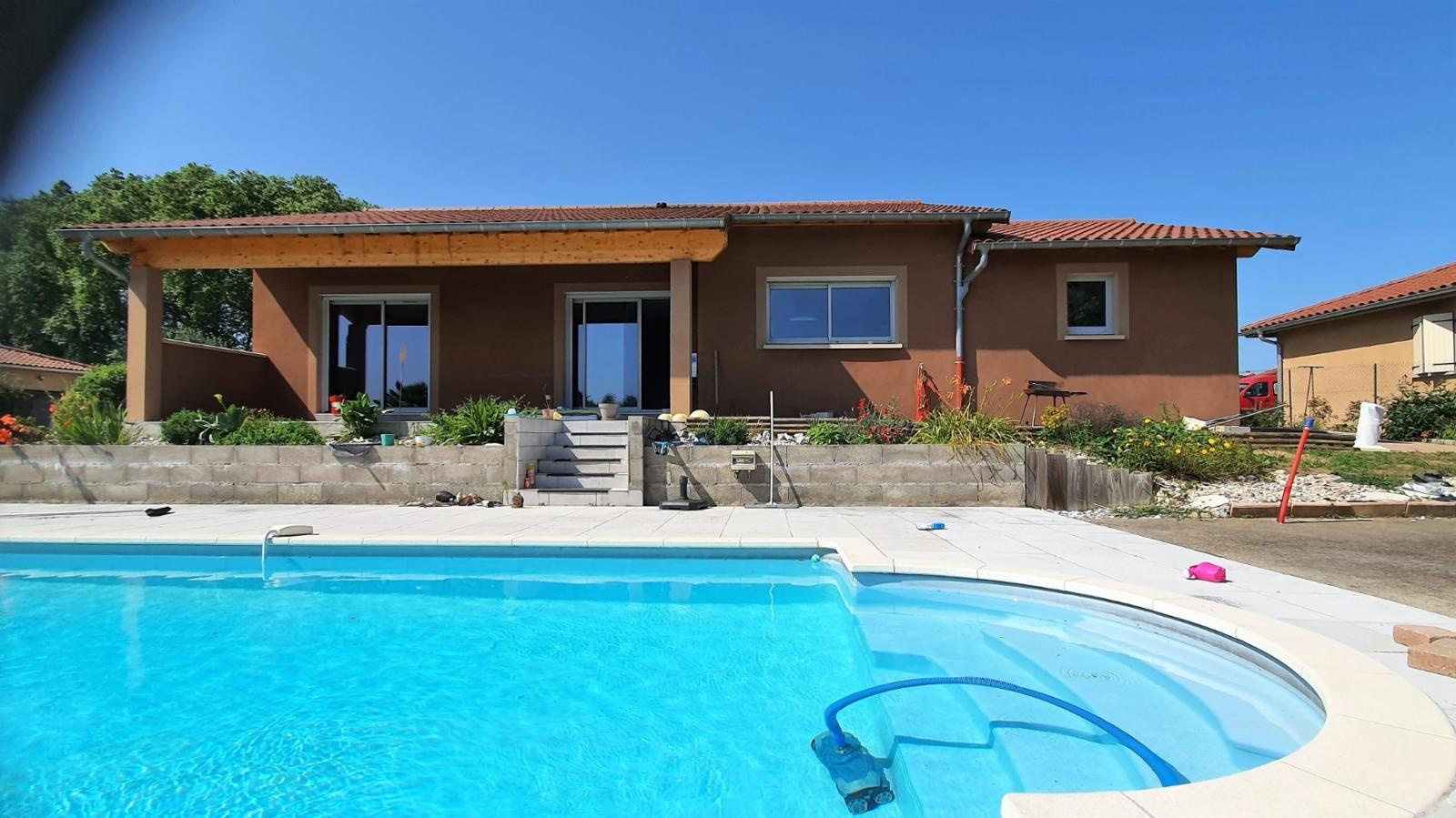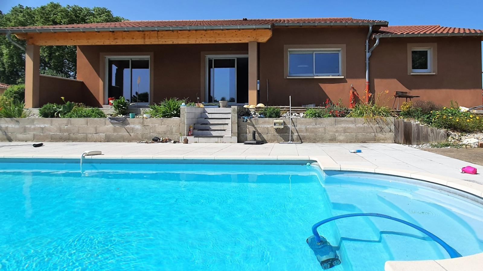 Très lumineuse, cette maison est composée d'un séjour-salon avec cuisine équipée ouverte de 68.85 m2; une chambre avec dressing, une chambre, une salle de bains avec douche et baignoire, une buanderie; un garage; le tout sur un terrain d'env 850 m2 entièrement clos. Une piscine de 8 x4 et un jardin vue campagne, une immense pièce de vie donnant sur la piscine vous donneront l'impression d'être en vacances en permanence ! Possibilité de faire une troisième chambre facilement. .